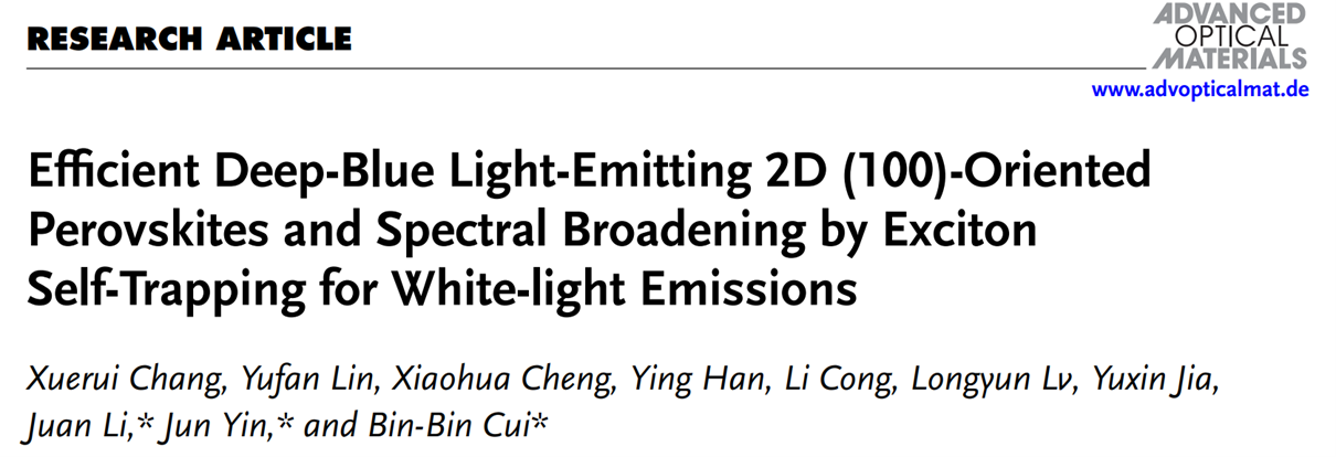 近日,北理工前沿交叉科学研究院崔彬彬课题组在《Advanced Optical Materials》发表题为“Efficient Deep-blue Light-emitting 2D (100)-Oriented Perovskites and Spectral Broadening by...