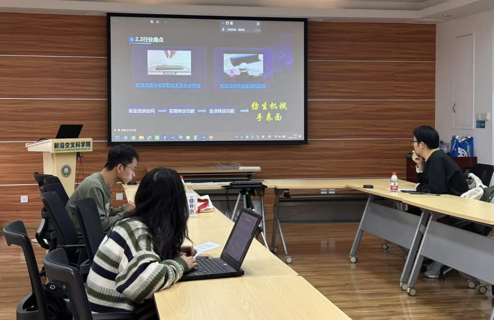 为助力参赛团队在“挑战杯”等科创竞赛中取得更好成绩,3月21日下午14点,前沿交叉科学院组织开展了本学期第四次双创竞赛辅导会。院长助理李团和赵山博博士来到现场进行项目指导。 本次研讨会在中关村校区和良乡校区同步举行,旨在为即将参加更高水平竞赛的团队提供精细化、专业化的打磨指导。本次辅导会共有5个项...
